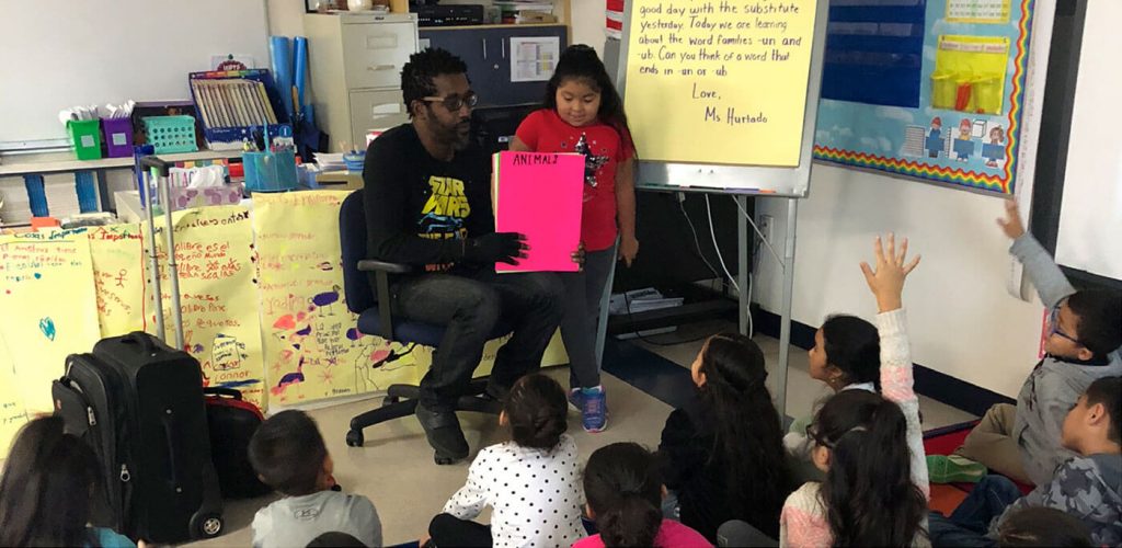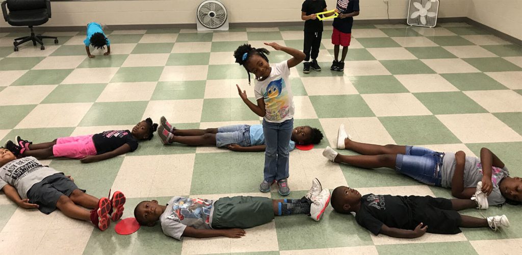 Using the weekly vocabulary list provided by the teacher, we create songs that support the at-hand language concept (such as short vowels). The songs are played and kinesthetic movement is used to help build continuity to reinforce the words’ meaning.