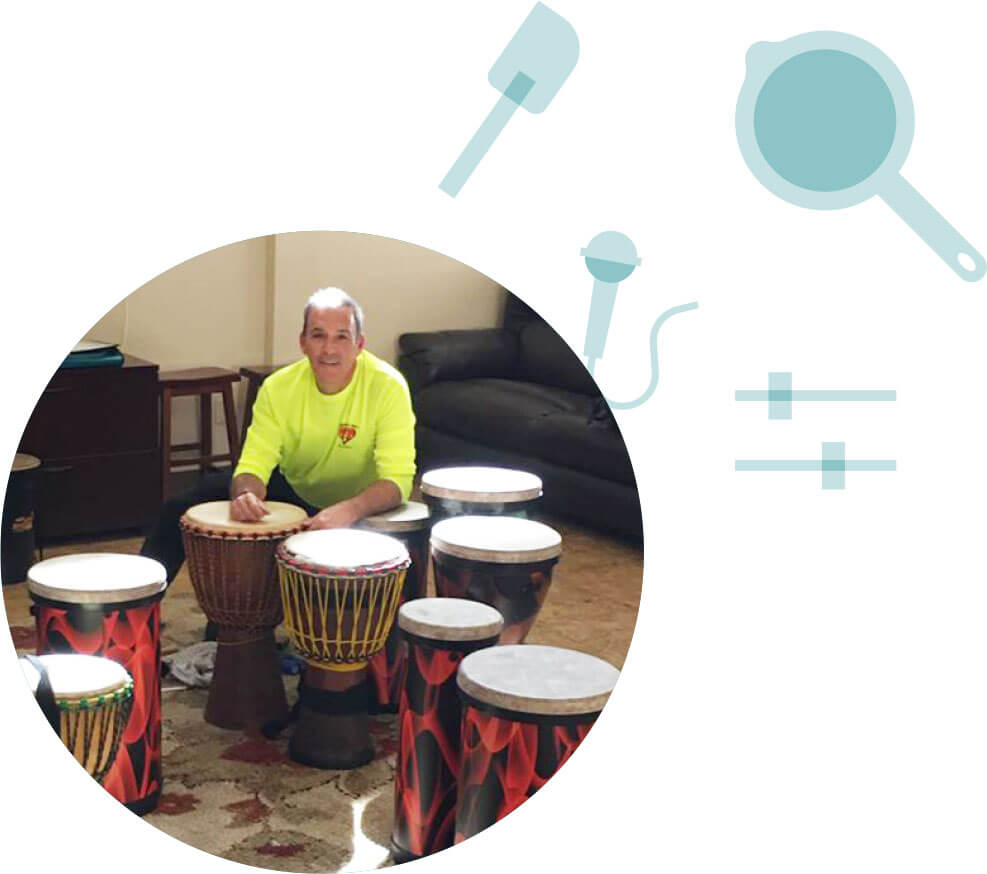 The drum circles use drumming techniques and rhythmic methods as a therapeutic and exploratory way to heal the participants.  It supports veterans and their family members.